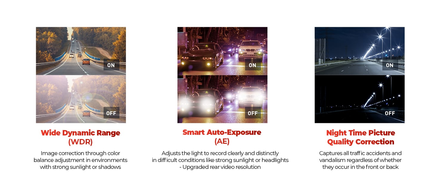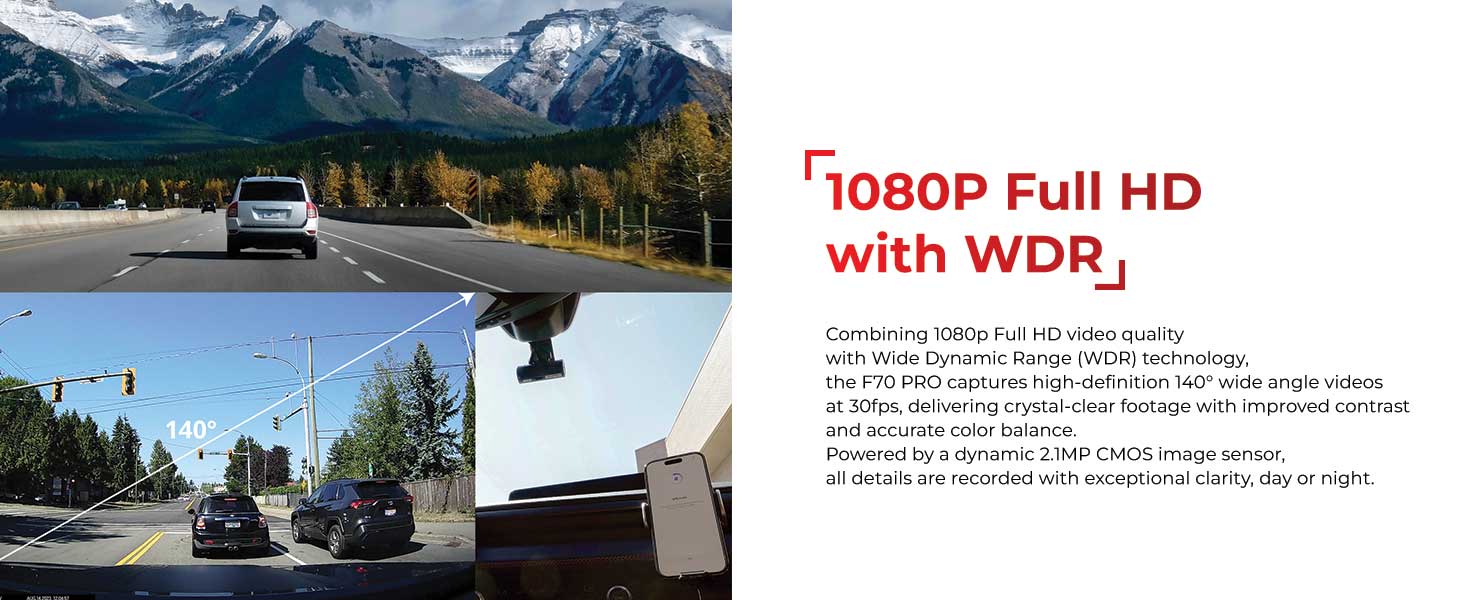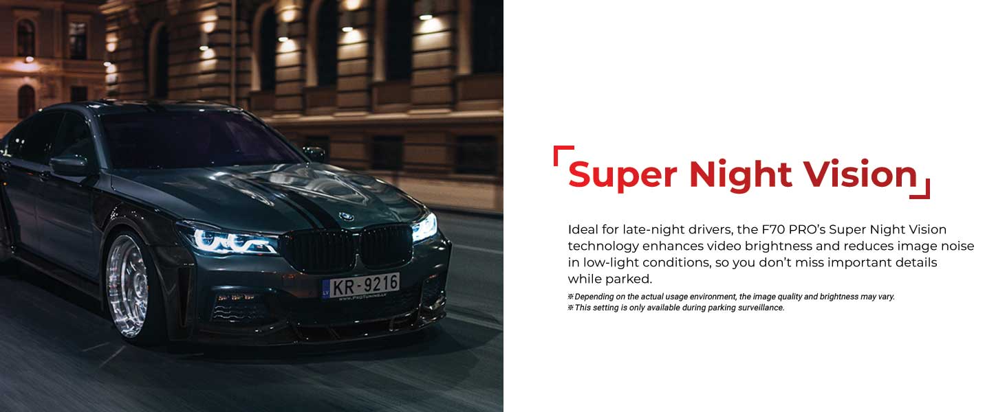 【超级夜视*】F70 PRO 的超级夜视技术非常适合深夜驾驶,可在低光条件下增强视频亮度并降低图像噪点,让您在停车时不会错过重要细节。 *仅在停车监控模式下可用