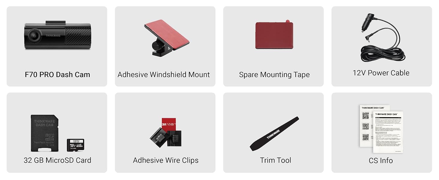 行车记录仪、12V 电源线、挡风玻璃支架、备用安装胶带、32GB MicroSD 卡、粘性线夹、修边工具、保修卡和二维码上的快速入门指南。