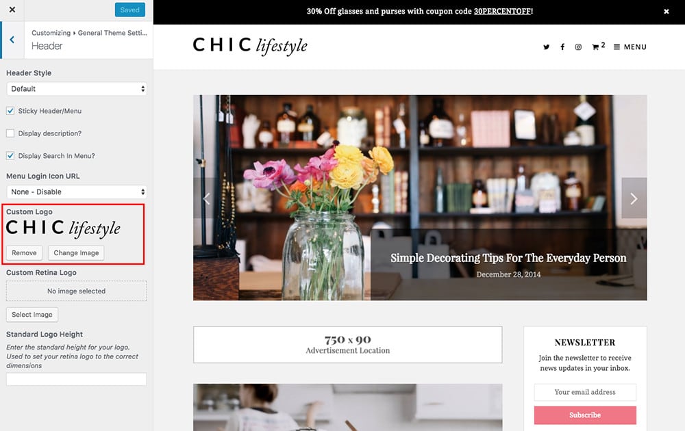 To upload a new logo, log in to WordPress and navigate to Appearance > Customize. Depending on your WordPress theme, you may see a "Branding" or "Header" section where you should find an option to upload a custom logo.