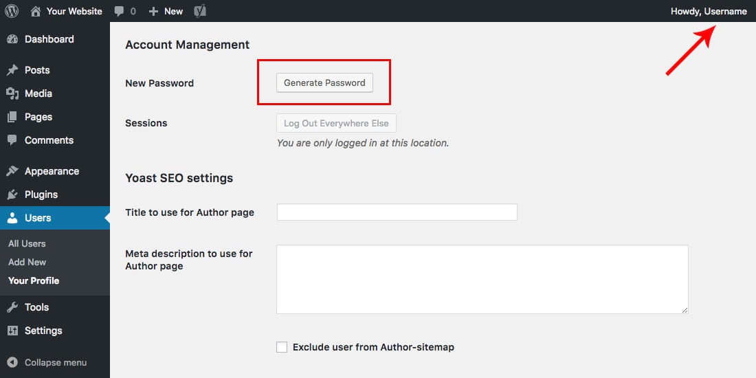 If you are logged into your WordPress account, click on your username in the admin toolbar at the top right of the screen (if your admin bar is disabled, simply go to Users > Your Profile from the dashboard).